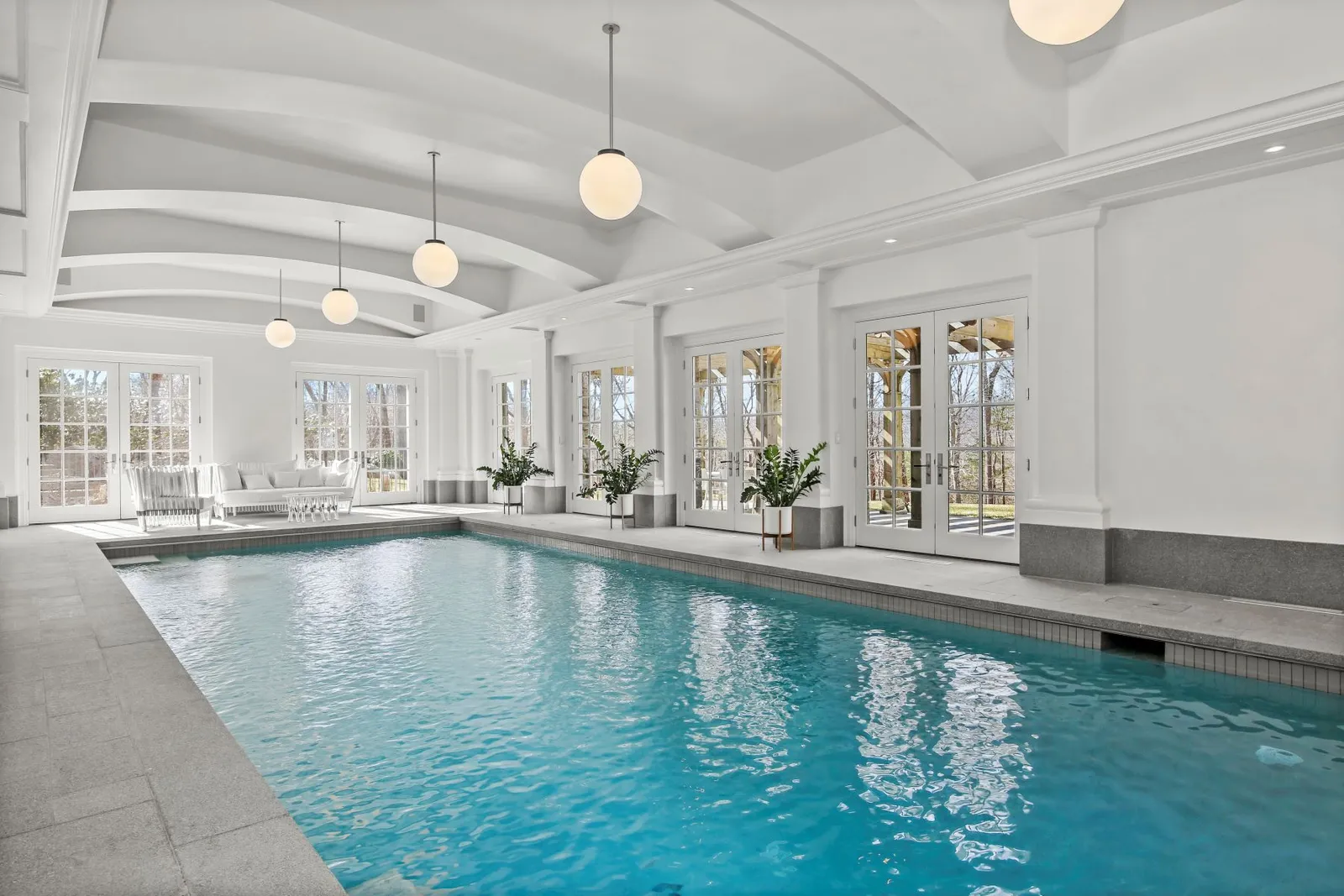 French doors from most of the formal rooms open to a spacious, lakefront patio. Clad in contemporary designer finishes, the house offers six bedrooms, seven baths, seven fireplaces, and luxurious amenities including an all-floor elevator and magnificent indoor pool.