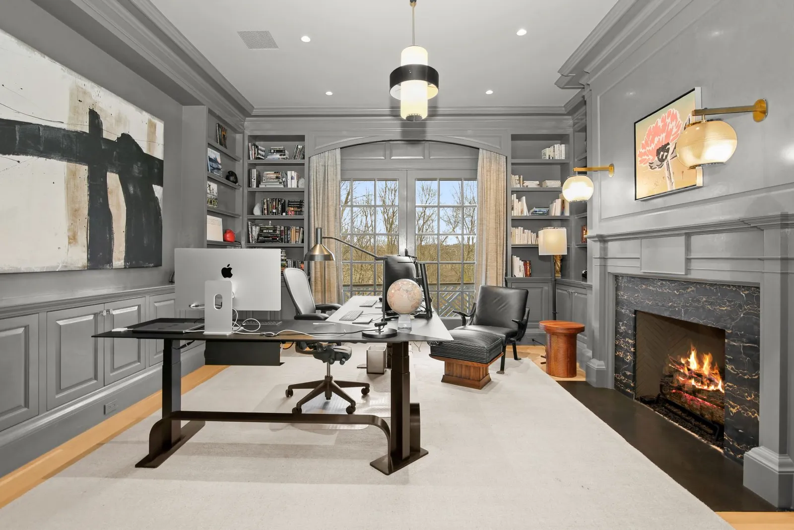 The attached four-car garage has an electric car charger and a staff bedroom and bath above the garage. The sweeping 21+ acre grounds include a tennis court and stylishly renovated two-bedroom guest house with two baths, a full kitchen, dining room and attached garage. A lakeside fire pit leads to a floating dock for non-motorized boating and fishing.