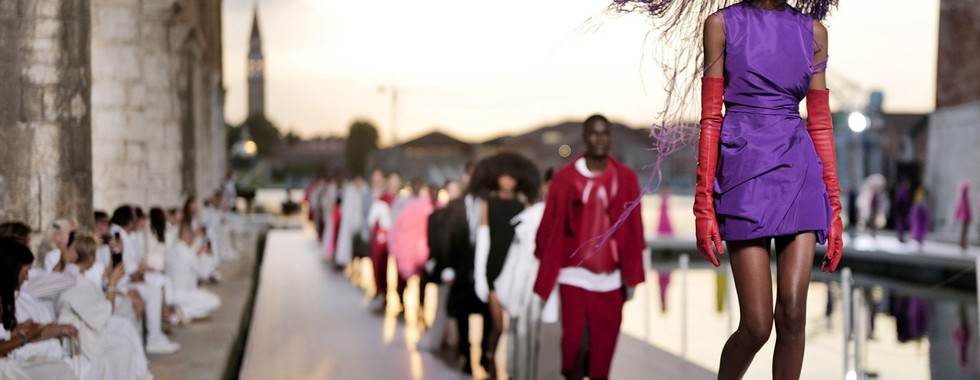 The first model stepped onto the white walkway in a short cocoon red satin cape-dress and a large, plumed hat with red feathers flying in the air behind her, opening a stellar Valentino Haute Couture live stream show from Venice. This show elevated haute couture to a new level regarding clothes, gestures, and aesthetic language.